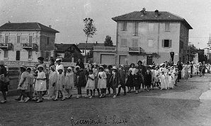 Processione S.Luigi - Borgomanero incrocio tra Via Dante e Via Scuole anni 30